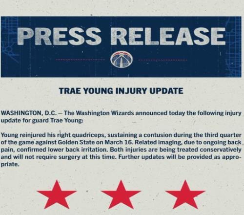 奇才官方:特雷楊右股四頭肌挫傷+下背部刺激,將無限期缺戰